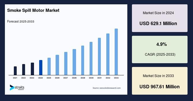 According to StraitsResearch, the global smoke spill motor market size was valued at USD 629.1 million in 2024 and is estimated to reach USD 967.61 million by 2033, growing at a CAGR of 4.9% during 2025-2033.
