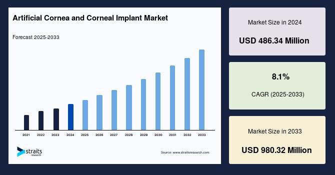 According to StraitsResearch, the global artificial cornea and corneal implant market size was valued at USD 486.34 million in 2024 and is estimated to reach USD 980.32 million by 2033, growing at a CAGR of 8.1% during 2025-2033.