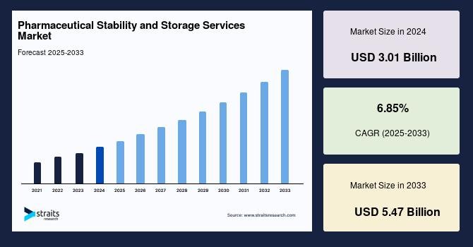 According to StraitsResearch, the global pharmaceutical stability and storage services market size was valued at USD 3.01 billion in 2024 and is estimated to reach USD 5.47 billion by 2033, growing at a CAGR of 6.85% during 2025-2033.